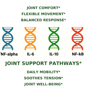 Research in the fields of arthritis and joint-health sciences has identified TNF-alpha, IL-6, IL-10, and NF-κB as key genetic signaling regulators that help maintain the body’s normal immune and inflammatory balance. Each of these molecular pathways helps coordinate how joint tissues naturally respond to everyday wear, physical stress, and the aging process—contributing to overall joint comfort and flexibility. These same pathways have also been the focus of extensive scientific and pharmaceutical research exploring their importance in immune and joint health. The multi-pronged, plant-based nutrients in ArthritiCare by Nature naturally support these pathways, helping the body maintain joint integrity, flexibility, and comfort in well-researched, natural ways. This clean, research-inspired formula works in harmony with your body, offering gentle, effective support without harsh synthetic additives or unnecessary chemicals your body doesn’t need.